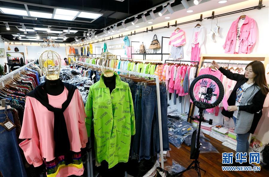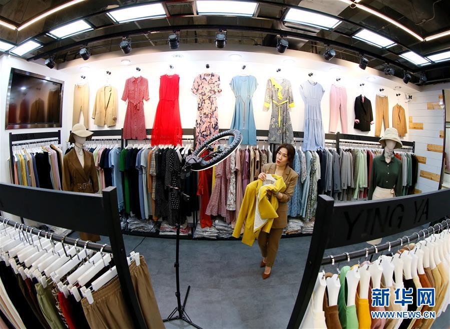 4月24日,在即墨服装批发市场,莹雅生活馆的销售员通过直播平台向顾客推荐服装。 近日,为帮助服装行业经营商户解决疫情期间采购商客流量少、产品销售不畅的难题,青岛市即墨区市场管理部门邀请专业直播机构对商户进行培训,带动2000多家商户运用互联网平台进行直播售货,拓展国内市场销路。 新华社发(梁孝鹏 摄)