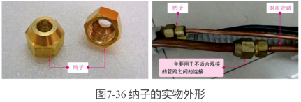 纳子是一种螺纹连接部件,外形与螺母相似,如图7-36所示,主要用于不适合焊接的管路之间的连接,如连接管路与室内机液管、气管连接。