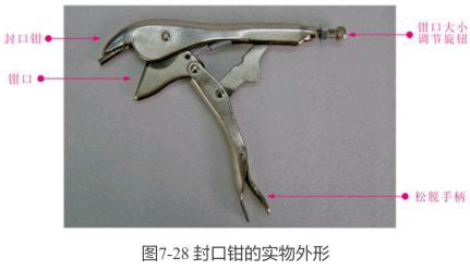 封口钳也称大力钳,通常用于对电冰箱制冷管路的端口处进行封闭,常见封口钳的实物外形如图7-28所示。