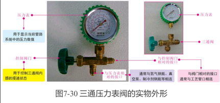 三通压力表阀是三通阀和压力表的综合体,包含控制阀门、三个接口和一个显示压力值的压力表,如图7-30所示。.