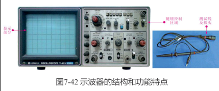 示波器是一种用来展示和观测信号波形及相关参数的电子仪器,它可以观测和直接测量信号波形的形状、幅度和周期。示波器主要由显示部分、键钮控制区域、测试线及探头等部分构成,如图7-42所示。