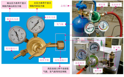 减压器是一种对经过的气体进行降压的设备。减压器通常安装在高压钢瓶(氧气瓶或氮气瓶)的出气端口处,主要用于将钢瓶内的气体压力降低后输出,确保输出后气体的压力和流量稳定。图7-37所示为减压器的实物外形及适用场合。