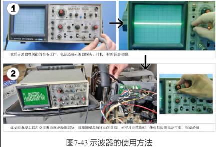 如图7-43所示,使用示波器也需要先做好检测前的准备工作,即设定好示波器的初始状态,然后进行检测操作,调整相关键钮使显示屏显示出完整、清晰的信号波形即可。