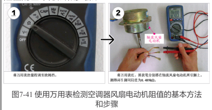 图7-41所示为使用万用表检测空调器风扇电动机阻值的基本方法和步骤