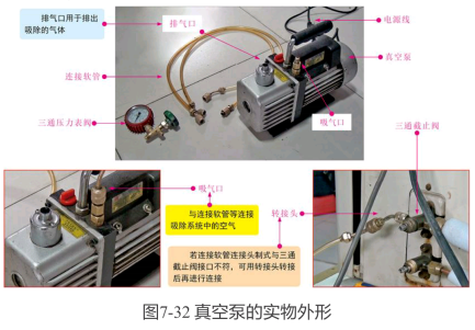 图7-32为常用真空泵的实物外形。使用真空泵时,需要将其与三通压力表阀进行连接。空调器检修中常用的真空泵的规格为2 ~4L/s (排气能力)。为防止介质回流,真空泵需带有电子止回阀。
