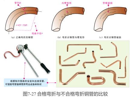 空调器的管路经常需要弯成特定的形状,为了保证系统循环的效果,对于管路的弯曲有严格的要求,在操作过程中,需要保证管道内腔不能凹瘪或变形,具体操作如图7-26所示。