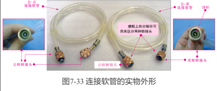 在实际应用中,还有一种常与连接软管配合使用的部件,称为转接头,主要有英制转接头(公转英接头)和公制转接头(英转公接头)两种。在公制转接头上,螺帽有明显的分隔环;在英制转接头上,螺帽无明显的分隔环,可以由此来分辨两种转接头,如图7-34所示。