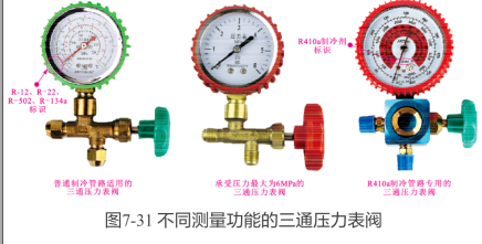 三通压力表阀有不同的规格。在空调器维修中,制冷剂类型不同,所选用的三通压力表阀也不同,通常R410a制冷剂管路系统需要专用的三通压力表阀,如图7-31所示。
