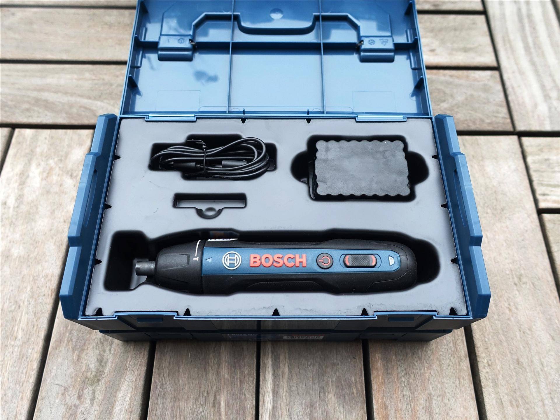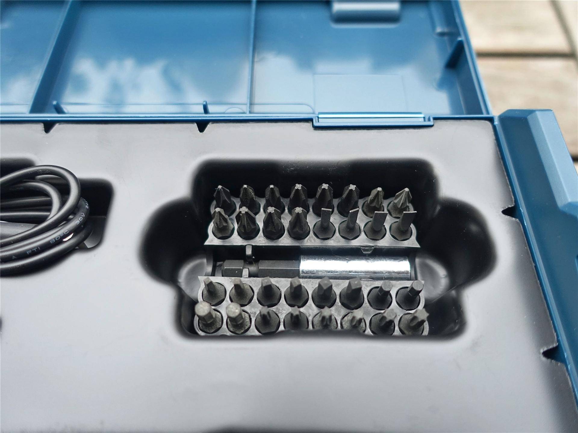 Mini工具盒内包含有一支博世GO二代、充电线和一组批头+延长杆。