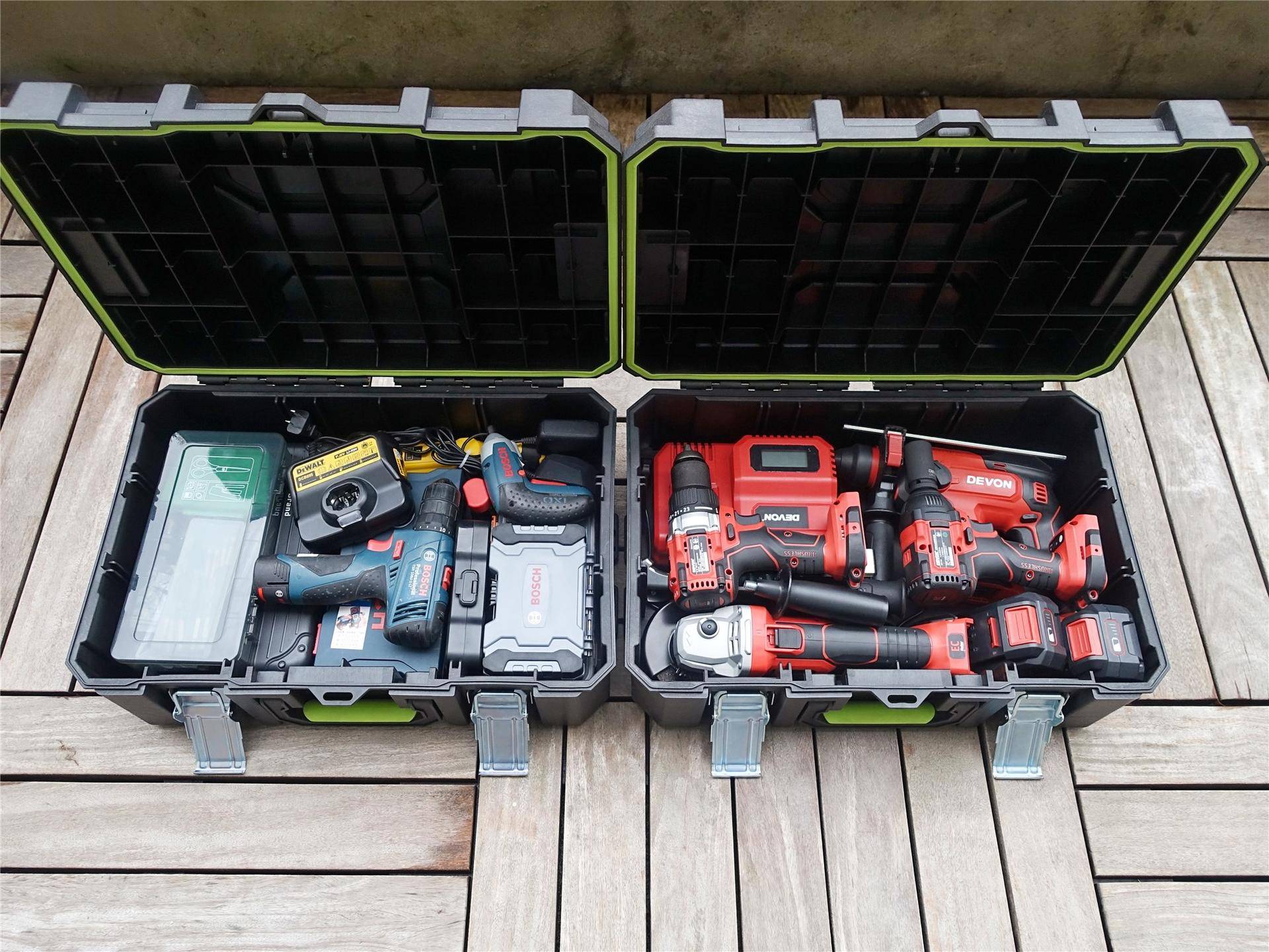 如果有需要的话,也可以将这两个盒子拆开后单独使用,每一个工具盒顶部都设计了一个坚固的手柄。