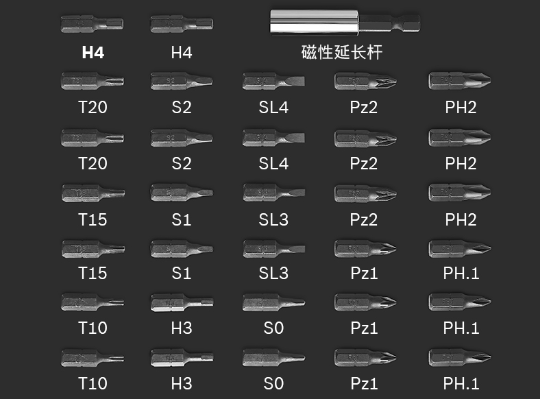 但这个Mini工具盒套装除了标配一支50mm加长批头外,还提供了32支25mm常用短批头和一支磁性延长杆。