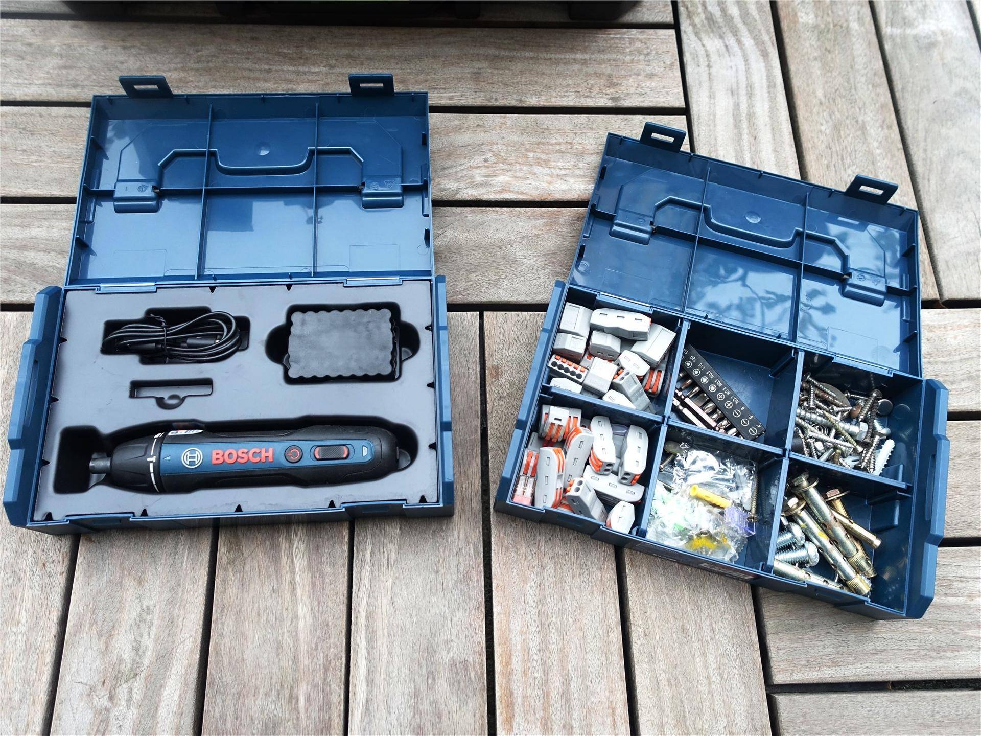 博世GO二代轻松收纳版,一个Mini工具盒用来收纳GO二代电动螺丝刀和数据线、批头,一个带 插片Mini收纳盒用来收纳日常所需的各种螺丝、钉子、小配件等,这么一个组合基本就能满足常规的维修和安装所需了,而对于家用来说,那就更加绰绰有余。