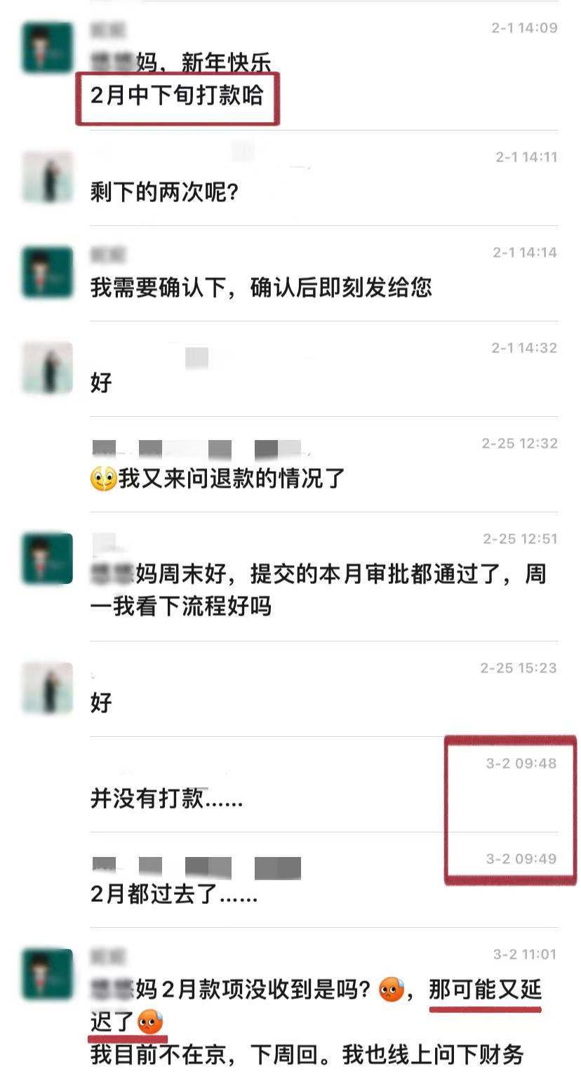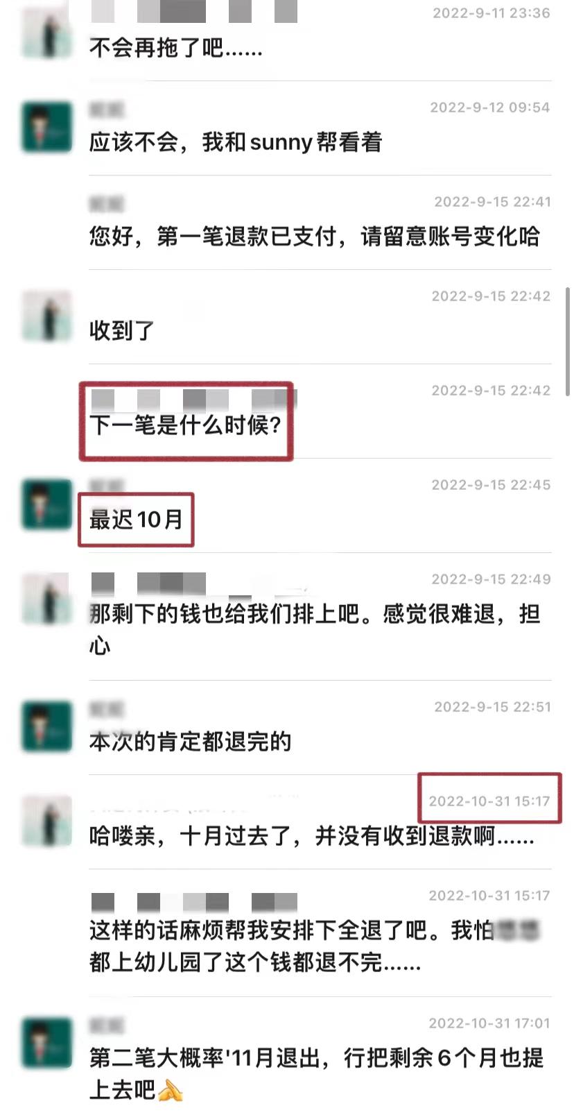 成女士说,托育机构销售人员曾承诺2022年9月和10月内分三次退完,但直至2022年10月31日,她只收到一笔退款。