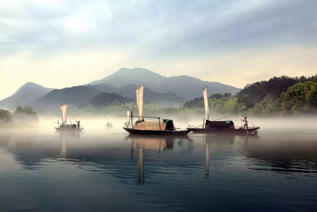 晨雾笼罩在江面上,早起的渔船踏着雾霭渐行渐远,留下诗意的剪影。
