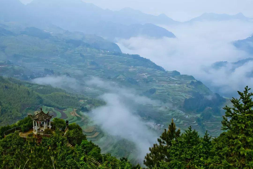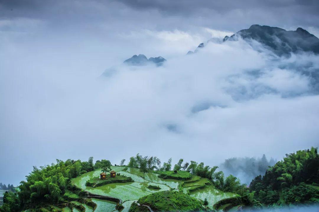 茂林修竹,群峰峥嵘,飞泉瀑布,云海流动于青山梯田间,美轮美奂,像极了童话里的仙境。