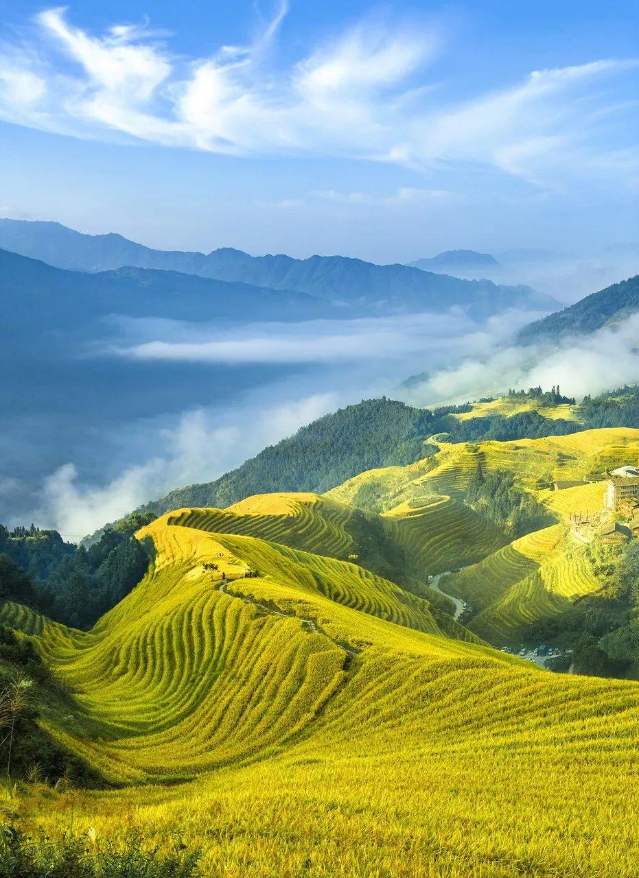 晨光里、暮色中,错落有致的梯田依山势上下延伸,形成一道道妙曼的曲线,折射出满世界的梦幻。