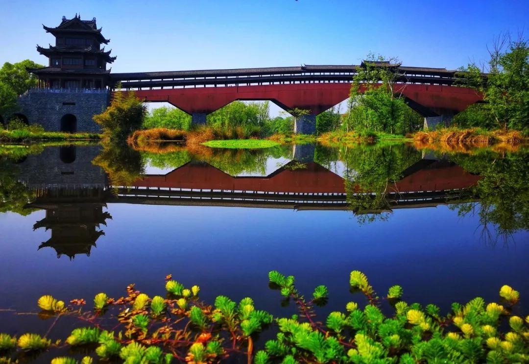 廊桥形如长虹卧波,亭台楼阁错落有致,透过花窗看风景,有别具一格的美。