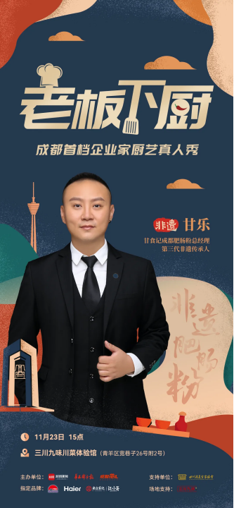在成都,美食和生活已融为一体。为持续弘扬天府美食文化、打造享誉全球 的国际美食名片,在业内标榜和塑造更多的餐饮传承人,讲好天府美食文化故事,「老板下厨」年度策划由此诞生,活动主办方将在行业内挖掘30位企业家,通过自己的“拿手好菜”,讲述企业家背后的创业故事。