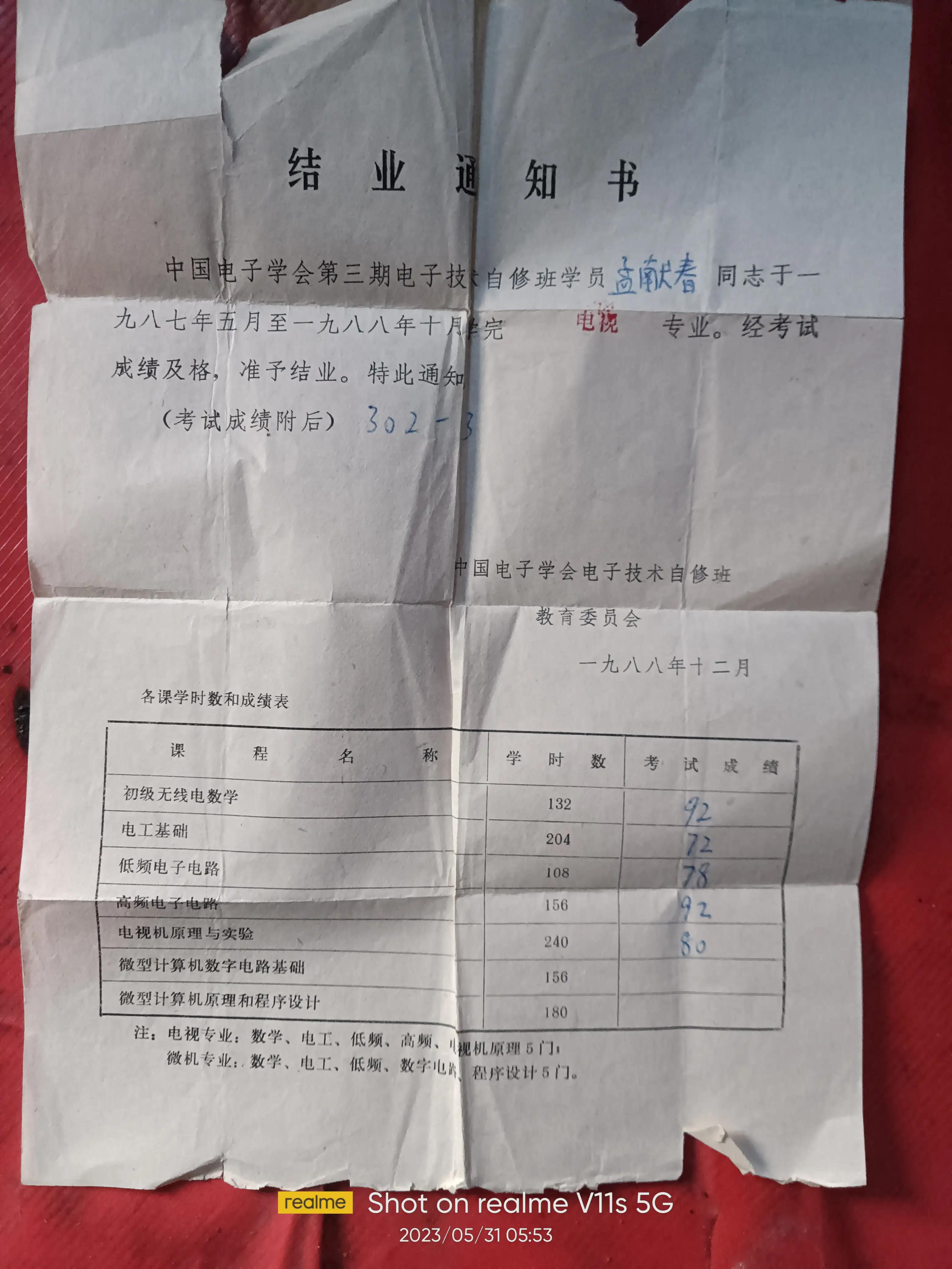 1977年5月,中国电子学会自修班开班了,我为了更好的提升自己的家电维修技术,也报名参加了。中国电子学会自修班共有五门课程,即《初级无线电数学》132课时,《电工基础》204课时,《低频电子电路》108课时,《高频电子电路》156课时,《电视机原理与实验》240课时。共计840课时。