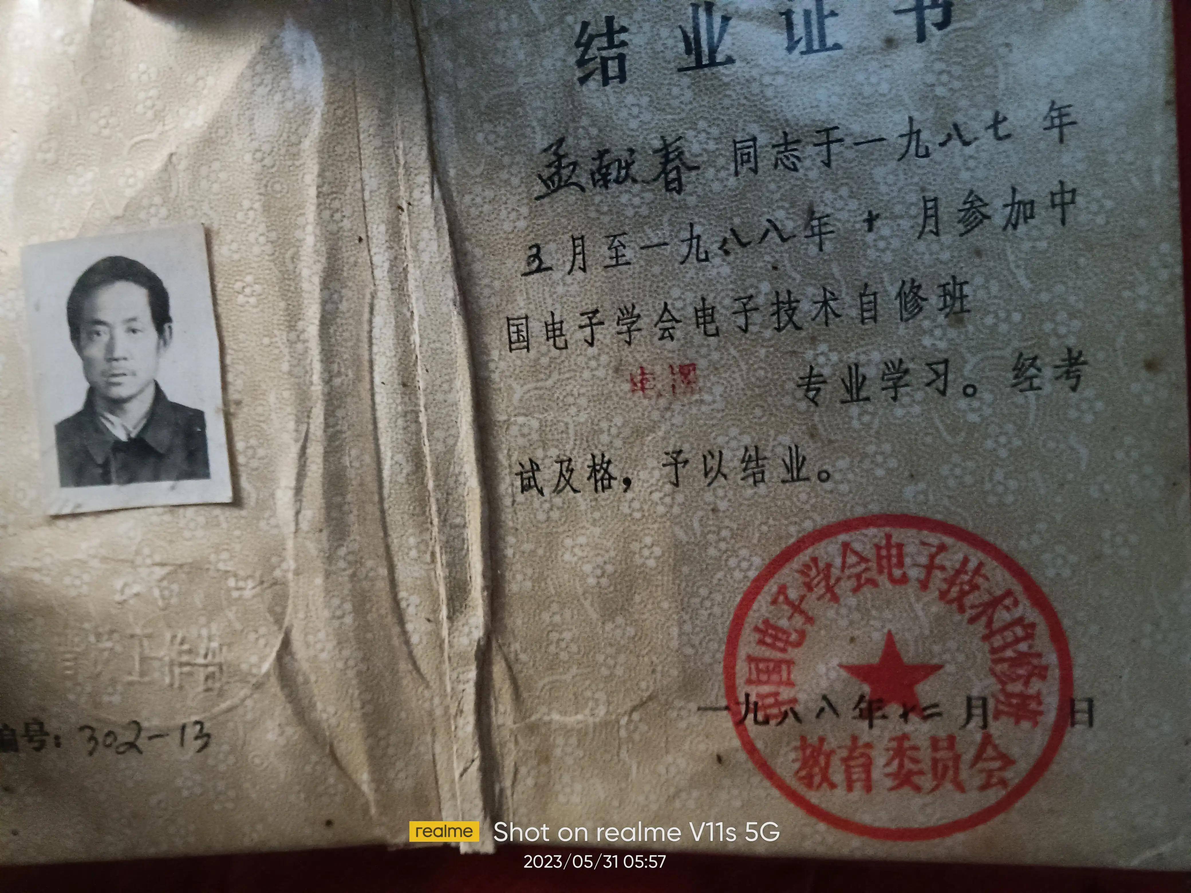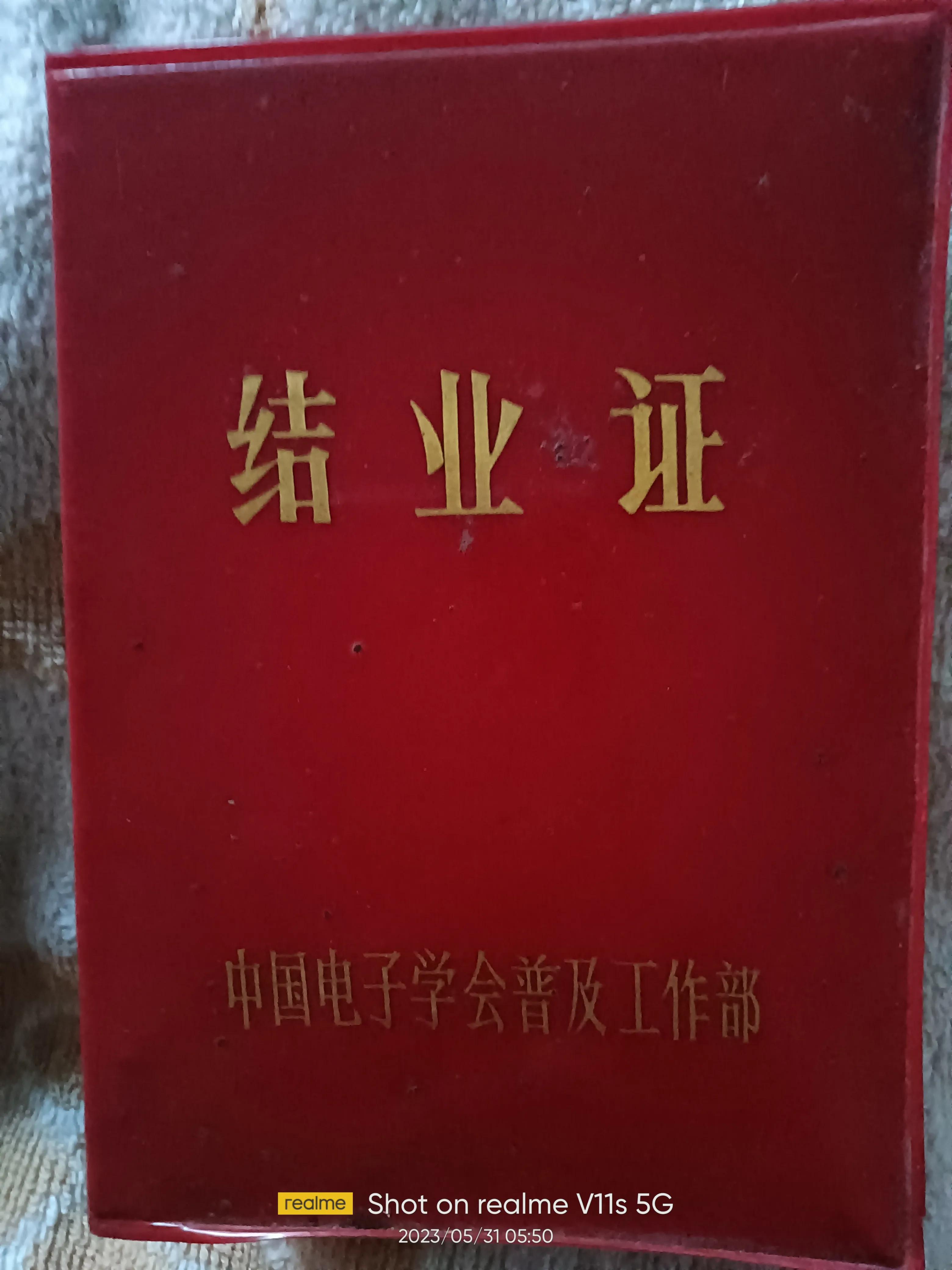 从1987年5月1日到1988年10月我完成了中国电子学会电子技术自修班的全部课程,取得了结业证书。同年12月15日又取得了广平县政府颁发的无线电修理技师证书。