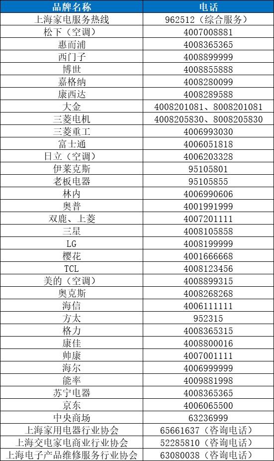 7月起,本市持续高温天气,烈日当头,为迎接各类家电维修高峰期的到来,962512上海家电服务热线、上海家用电器行业协会、上海交电家电商业行业协会、上海电子产品维修服务行业协会(“一台三会”)整理了一份最新版的“主要家电品牌全国统一服务电话一览表”,并向社会公布了“2023年第一批上海市家电维修服务行业398家推荐企业名单”,供市民在接受服务时明辨优劣,满足市民家电维修服务需求。
