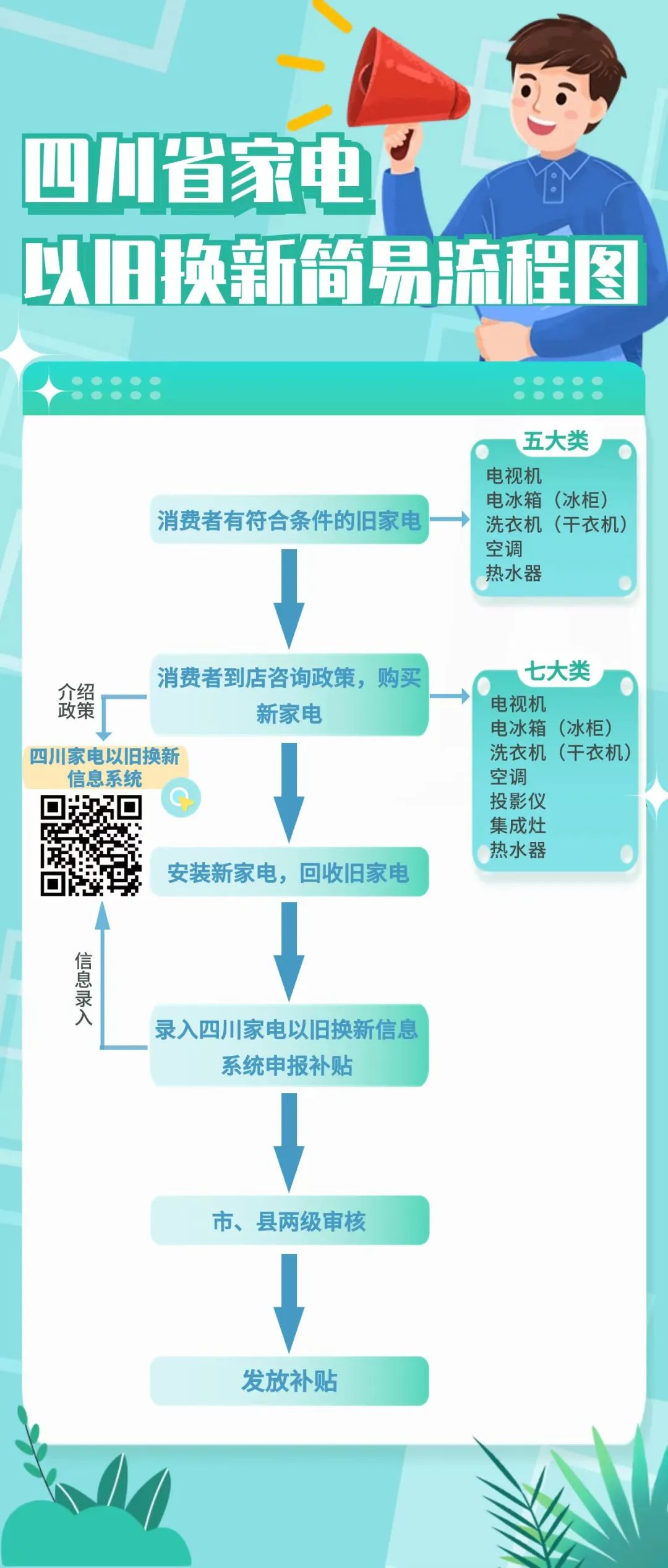 具体流程为:消费者在市内参与家电以旧换新的销售企业门店购买新家电,销售企业按让利优惠后的实际成交价格开具发票,个人消费者登录四川省家电以旧换新信息系统录入相关信息,主要包括:消费者姓名、身份证号、电话号码、银行卡号,新家电品牌、型号、能效等级、价格、购买发票等信息。