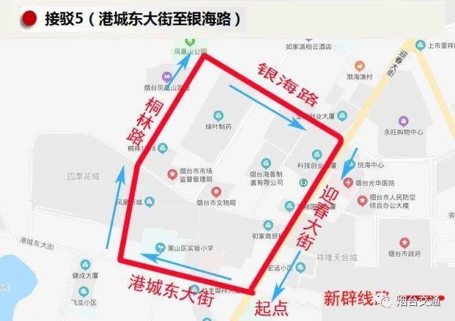 毓璜顶医院莱山分院、初家街道办事处、桐林路南口、桐林路、双语高中、银海路、中国农业银行莱山支行、凤凰小区。
