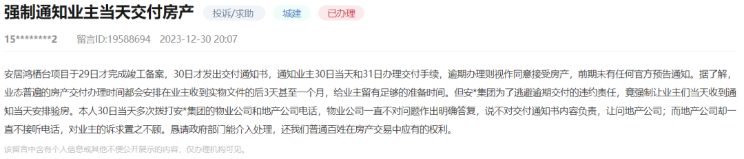 奥一新闻从人民网领导留言板处了解到,近日,有业主在平台反映,其所认购的安居鸿栖台项目 ,于29日才完成竣工备案,30日才发出交付通知书,并且通知业主30日当天和31日办理交付手续,逾期办 理则视作同意接受房产,项目前期未有任何官方预告通知 。