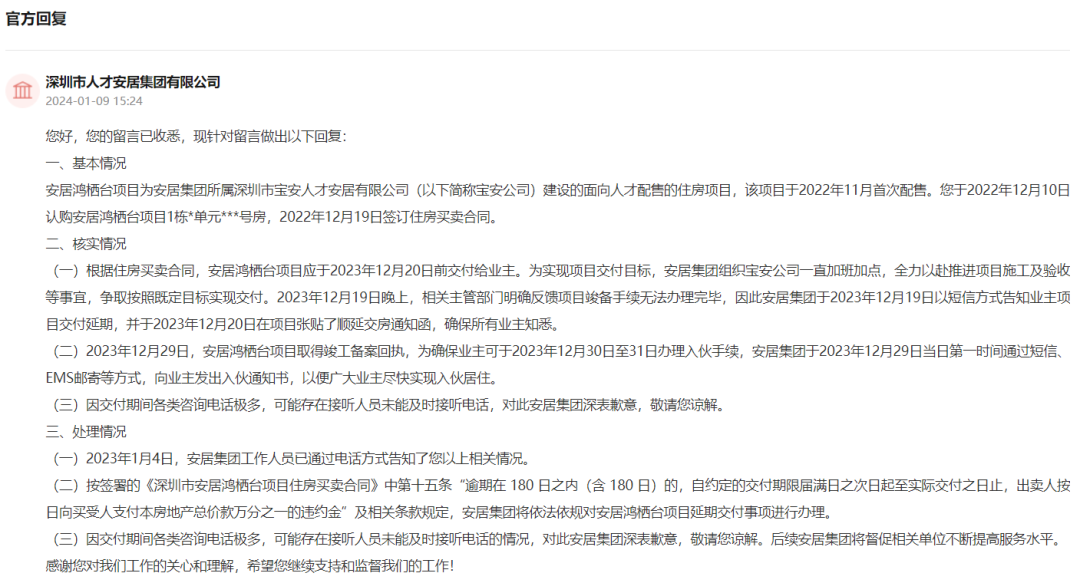 对于该业主所反映的情况,深圳市人才安居集团有限公司 作出了相关回应,其表示——安居鸿栖台项目为安居集团所属深圳市宝安人才安居有限公司(以下简称宝安公司)建设的面向人才配售的住房项目,该项目于2022年11月 首次配售 。