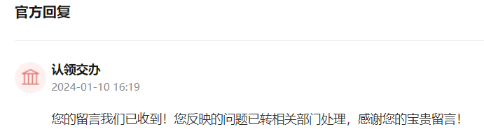 对于该名网友的问题,官方对此表示“您的留言我们已收到!您反映的问题已转相关部门处理,感谢您的宝贵留言!”