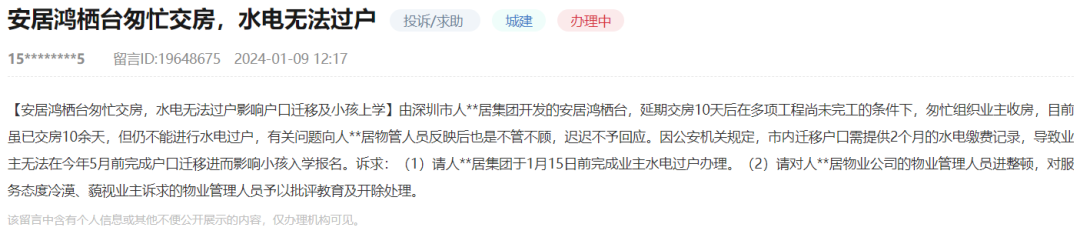而对于文章开头业主所反映的安居鸿栖台房产交付问题,1月9日,也有网友在留言板表示,因安居鸿栖台项目火速“验房”问题,导致业主无法在今年5月前完成户口迁移进而影响小孩入学报名 。