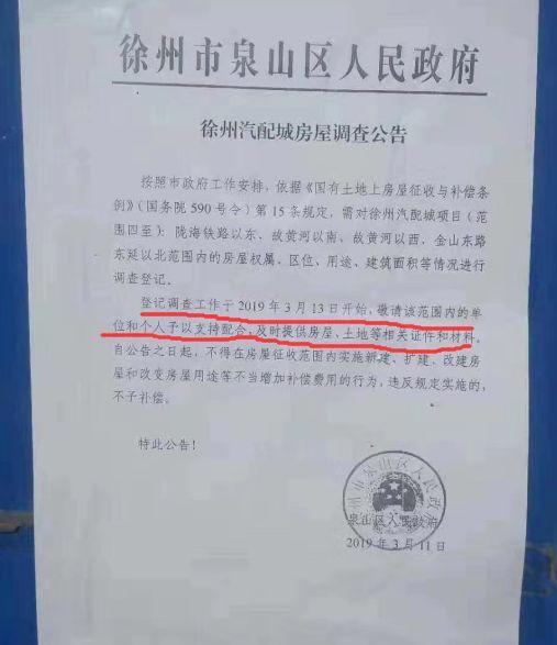 2019年3月份徐州泉山区人民政府也正式下发公告:汽配城房屋调查工序启动!
