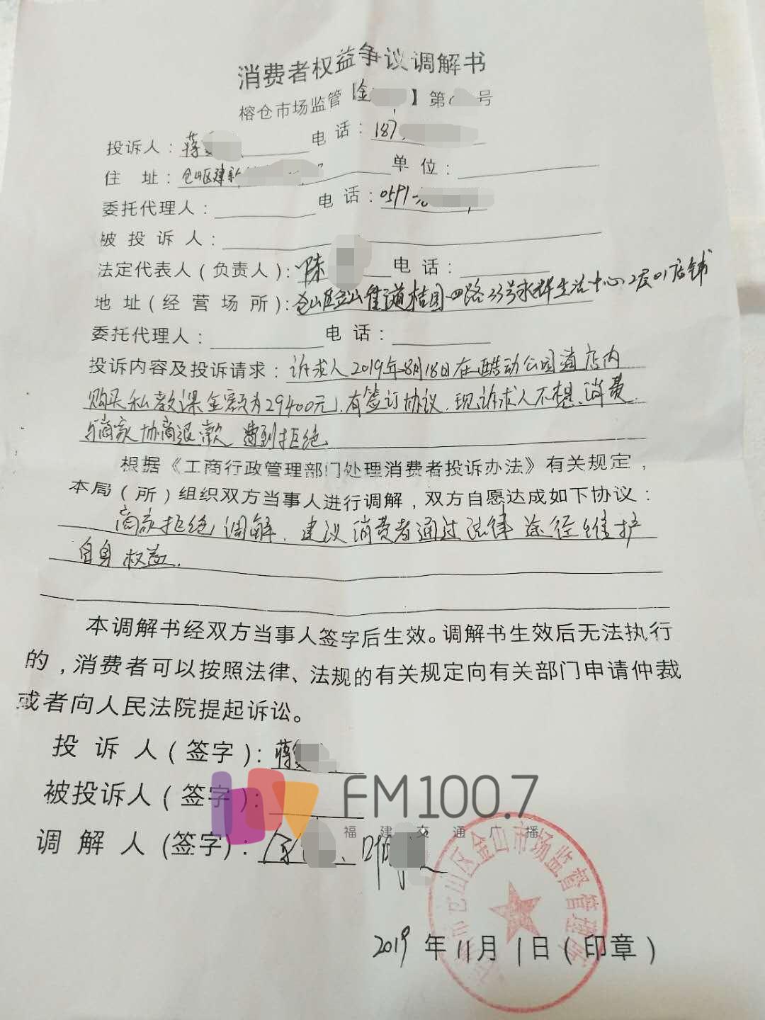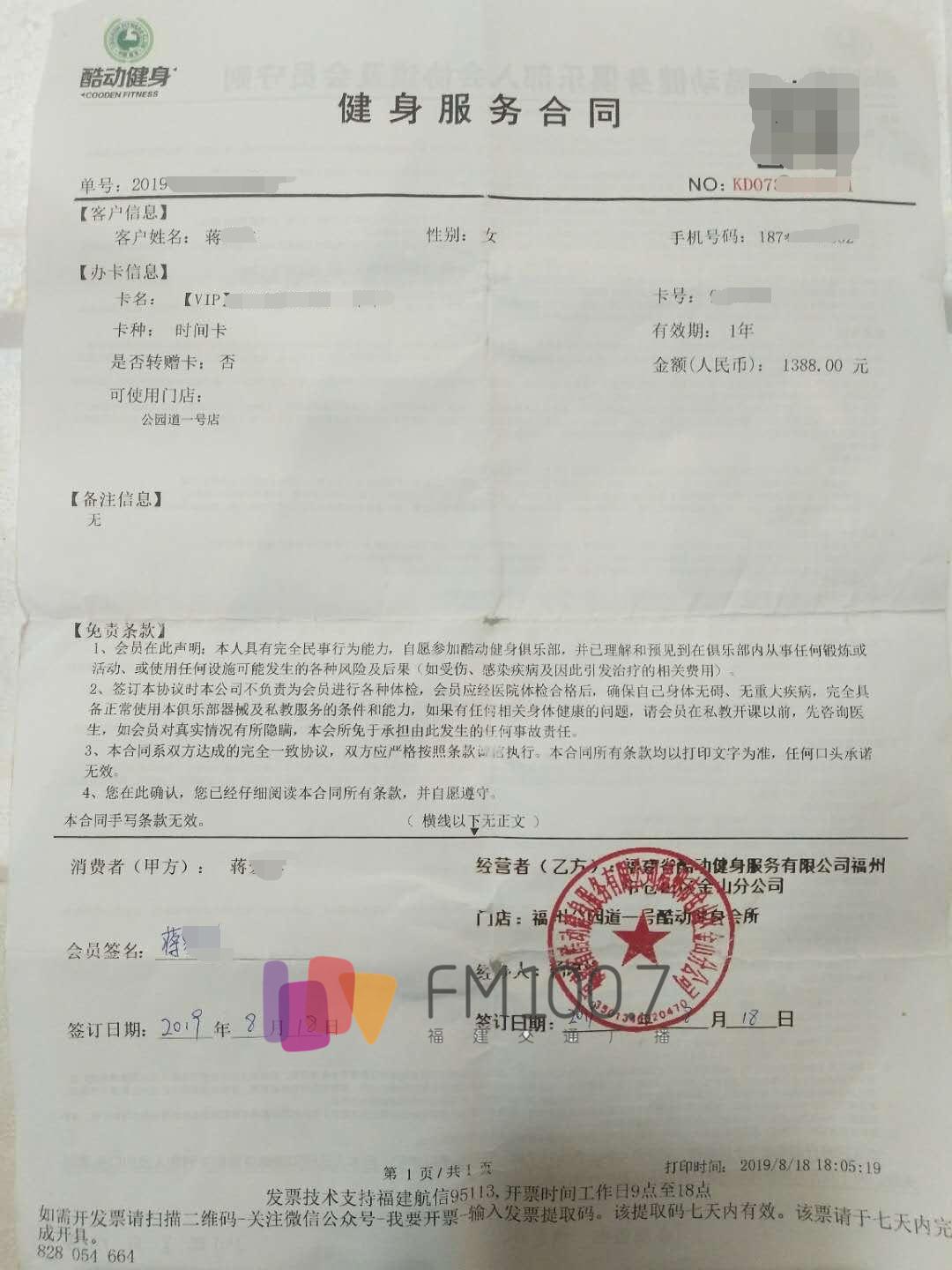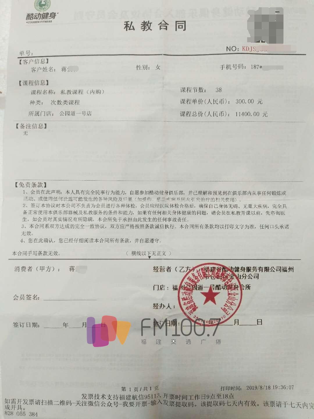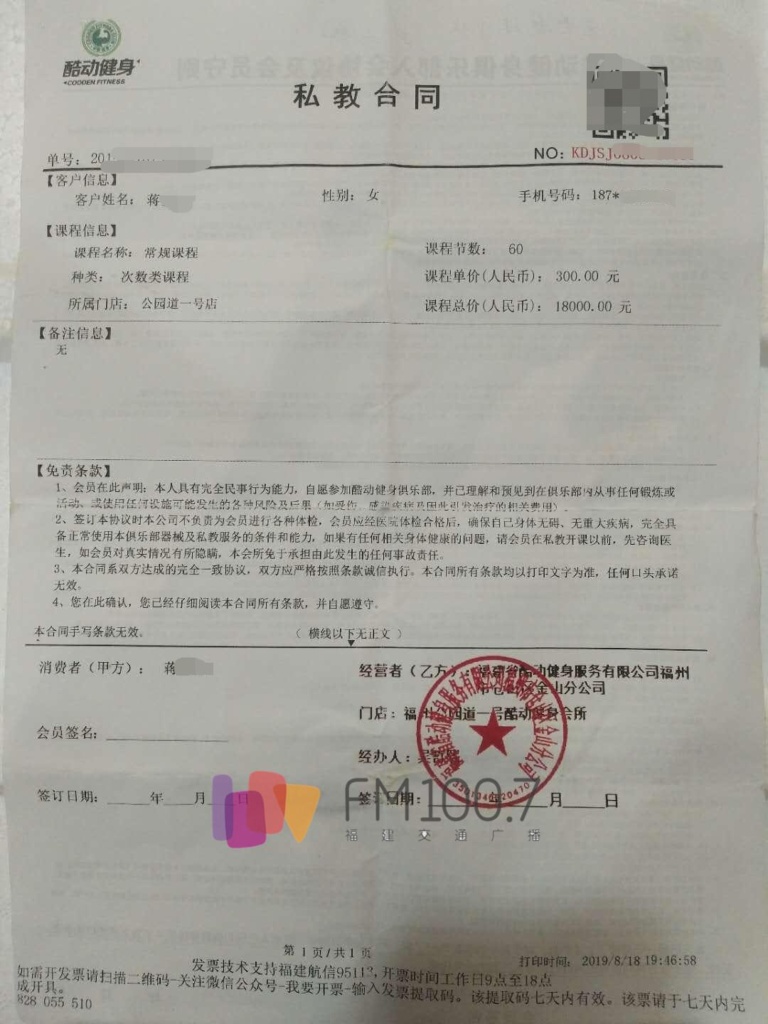 “明知她有明显的精神障碍,怎么能忽悠她买这么贵的课程呢”今天上午,1007接到车友林先生的投诉,说自己的女友蒋女士一直患有精神类疾病,不能参加剧烈运动,但去年8月在福州酷动健身公园道店被教练忽悠购买了近3万元钱的私教课,现在协商退款无门。