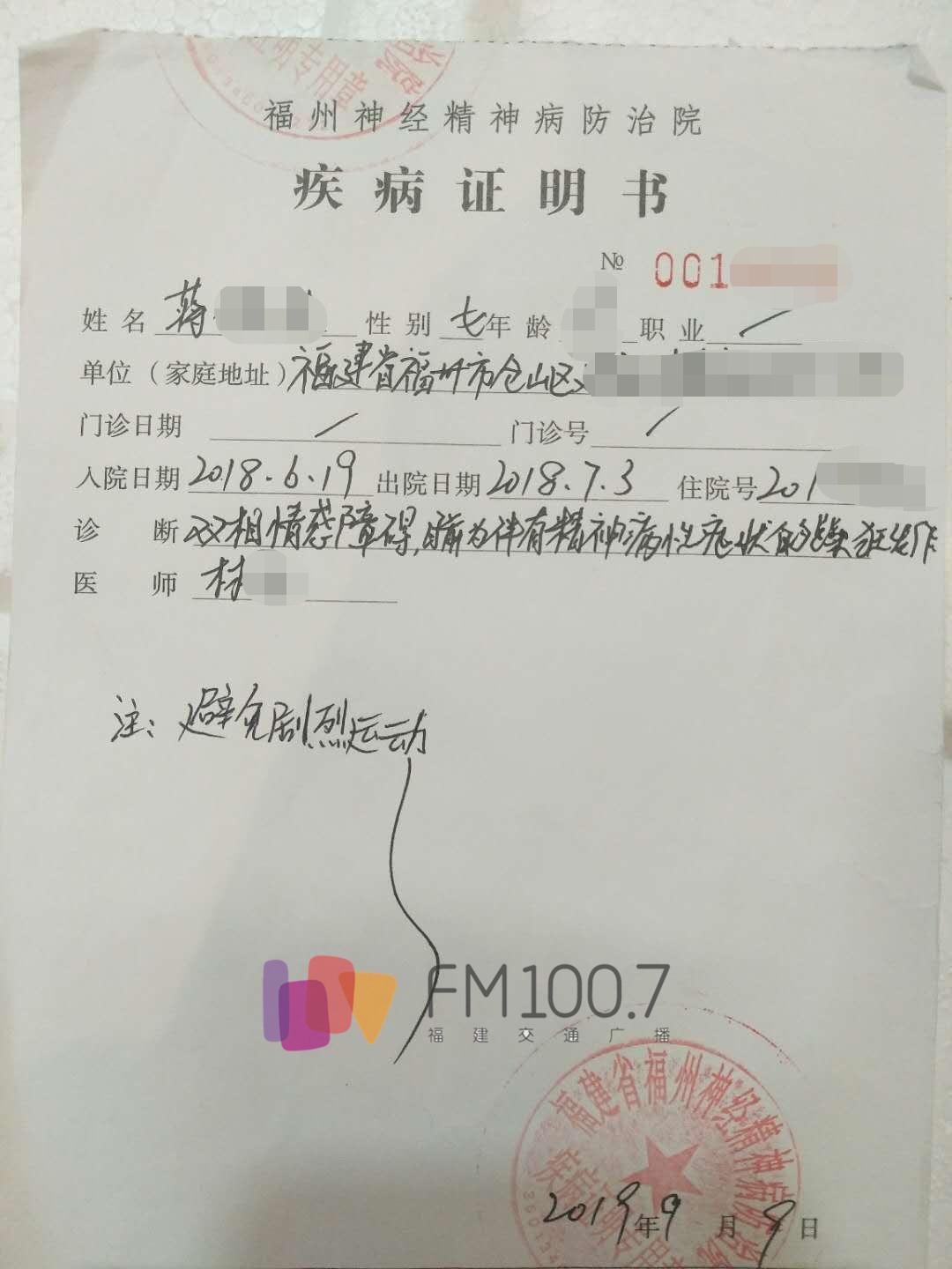 林先生告诉小七鲜生,女友一直患有精神类疾病,病情经常反复,需要常年服用控制类药物,2018年6月还曾在福州神经精神病防治院住了10几天的院,被诊断患上了双相情感障碍,并伴有精神病性症状的躁狂发作。