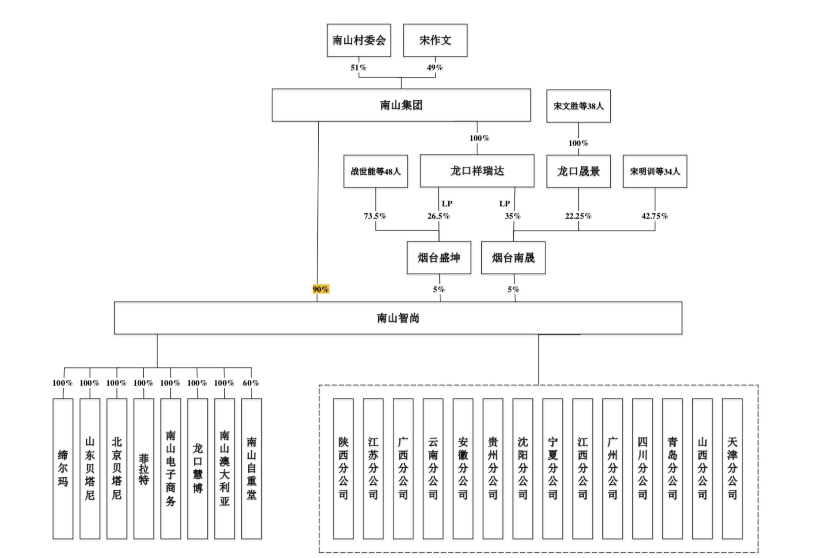 从股权结构看,南山集团由南山村村委会控股(持股比例51%)。据了解,在企业管理方面,实际权力一直由长期担任村委会主任的宋作文掌握,2015年前,宋作文一直担任南山集团董事长职务。在宋作文卸任以后,宋作文之子宋建波又接棒父亲担任集团董事长。