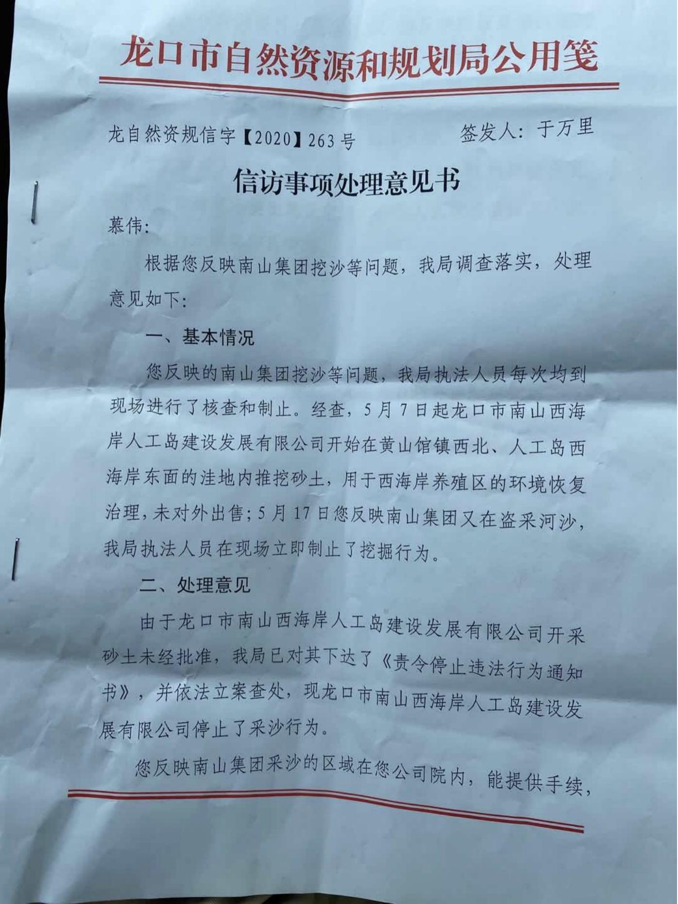 当地一家名为烟台百佳水产有限公司的企业主慕伟告诉记者,今年5月,南山集团人员在百佳水产公司厂区私采盗挖河沙20万方。对于盗挖河沙一事,慕伟提供的龙口市自然资源和规划局出具的相关文件显示,南山集团下属公司开采砂土行为未经批准,龙口市自然资源和规划局已下发《责令停止违法行为通知书》,并依法立案查处。