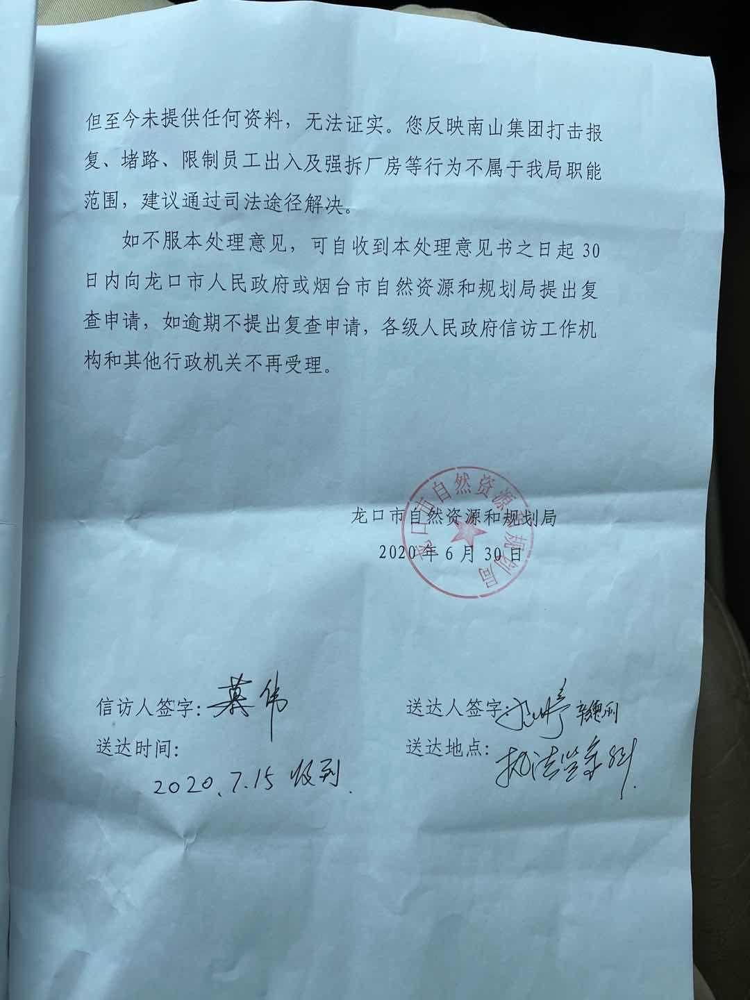 对于事件处理结果,新京报贝壳财经记者7月31日致电龙口市自然资源规划局,接电人员表示,待事件核实清楚后会主动联系记者,但截至发稿,记者尚未收到回复。