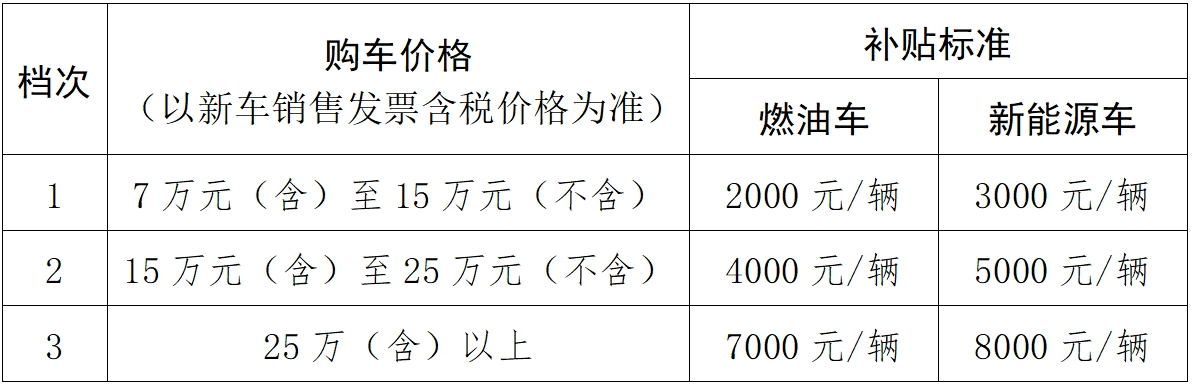 自《细则》印发之日至2024年12月31日期间,报废国三及以下排放标准燃油乘用车或2018年4月30日前注册登记的新能源乘用车,并购买符合节能要求乘用车新车的个人消费者,可享受一次性定额补贴。其中,对报废上述两类旧乘用车并购买符合条件的新能源乘用车的,补贴1万元;对报废国三及以下排放标准燃油乘用车并购买2.0升及以下排量燃油乘用车的,补贴7000元。