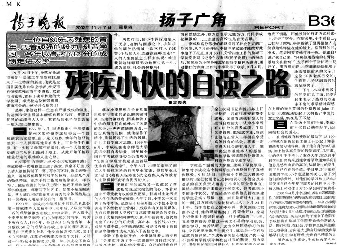 江苏淮安男子李成松出生时就四肢高度残疾,几乎无手、无脚。上小学差点没人要,先后三次参加高考,均超本一录取分数线数十分,但都因身体残疾没有高校愿意录取。2002年,扬子晚报一篇报道引起盐城工学院领导重视,李成松终于进入大学校园,其实,那一年他已自学本科毕业。第二年,李成松又通过国家司法考试,取得律师从业资格。大学毕业后,他以优异成绩考入苏大读研究生。