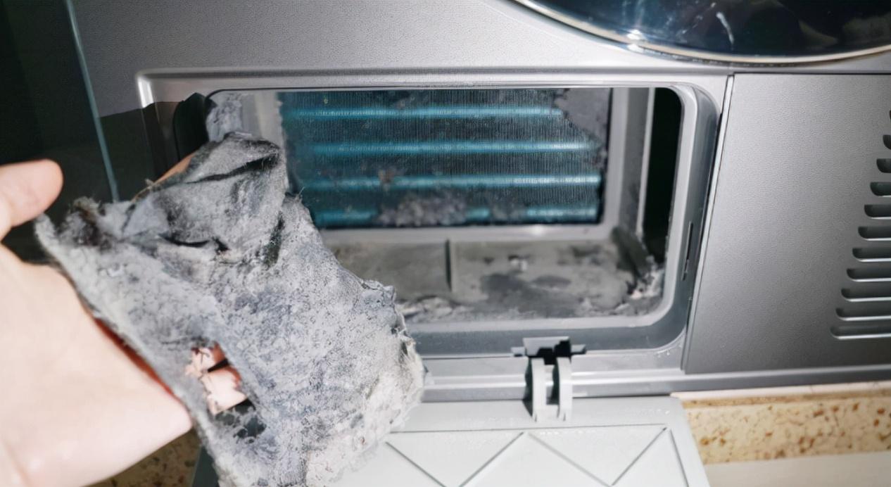 而大部分其它品牌的干衣机都没有这道滤网。所以当用久了之后拆开清洁口查看,往往可以看到上图所示的厚厚一层毛屑,清洁起来非常麻烦。这种种毛屑不卫生不说,还非常影响机器的烘干效率 ▲