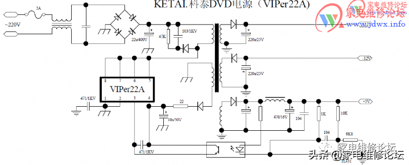 第二种就是电源模块坏。遇到电源模块故障的,遇到手头没有的型号,完全不必单独去买,去等(最烦一些评论说这个才几毛钱,某宝大把的,请问这些回复着能保证手头有所有的模块?去买不等?不要邮?维修本来就是灵活多变的)。VIPER22A就是一个简单的万能模块,不需要添加任何件,一直VIPER22a解决问题,电路简单只需要拆掉原机模块周围件,装上VIPER22A 导线跳至相关电路就行!从拆到装好也只需要几分钟!(作者:鄂东精锐/家电维修论坛www.jdwx.info)
