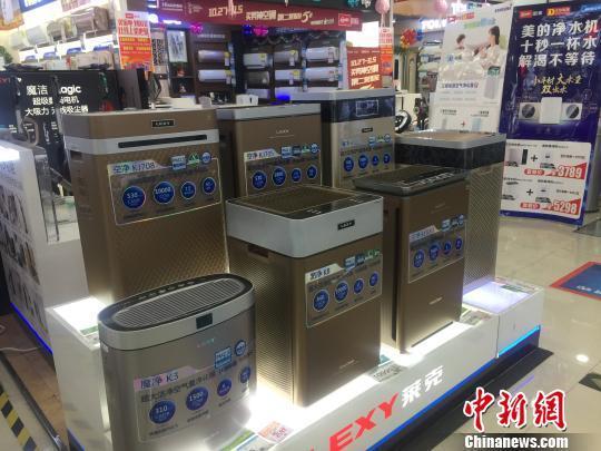 某大型家电卖场中,空气净化器、净水机等“健康”产品摆放在电梯口等显眼位置。 曾洁 摄