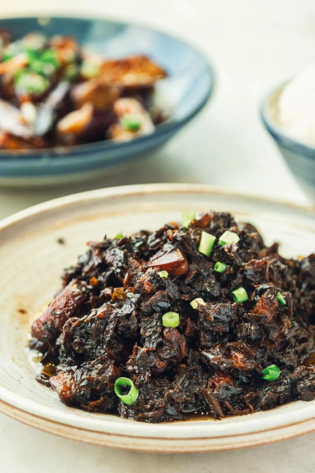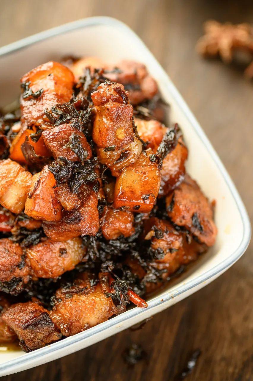 如果细细比较起来,川菜里的“梅菜扣肉”里梅菜滋味偏寡淡。选材上用的多是粗秆大叶的芥菜,腌制风干成梅菜后色泽偏黄,味道上本身就不够浓郁,更何况四川人做菜的时候,还得先把梅菜焯水,更是让那股子咸鲜风味流失了大半。