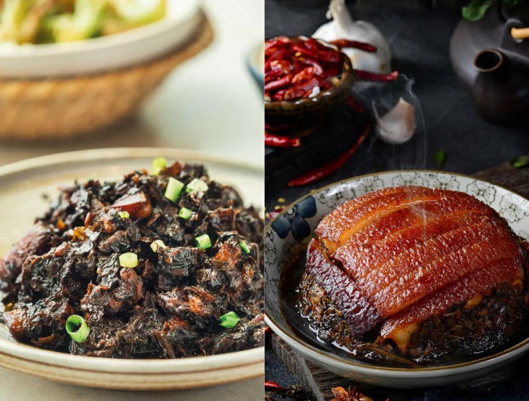 左为浙派的梅干菜肉,右为川菜里的梅菜扣肉。左图摄影/学文映像 右图/图虫·创意