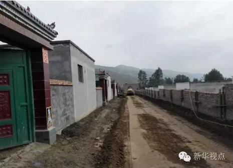 山坳里破旧的土坯房和山脚下正在兴建的新村庄形成鲜明对比,诠释出“天壤之别”的含义。