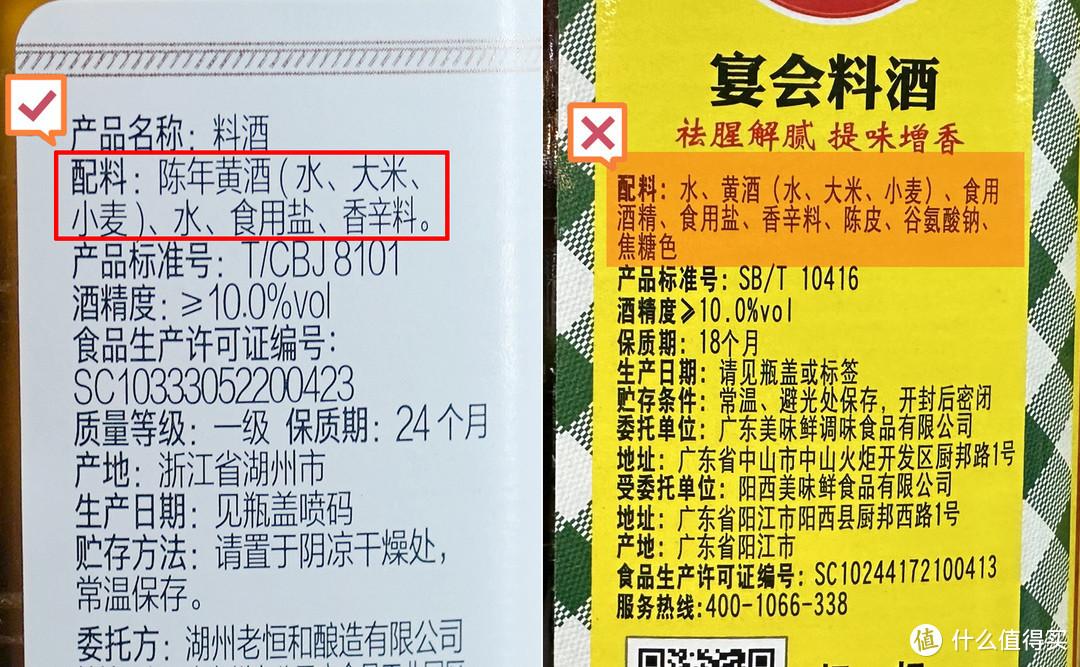酿造料酒的配料表,要么黄酒排在第一位,要么是“水+糯米”。而如果是“水+食用酒精”排在第一位,百分百是配制料酒,千万别买!