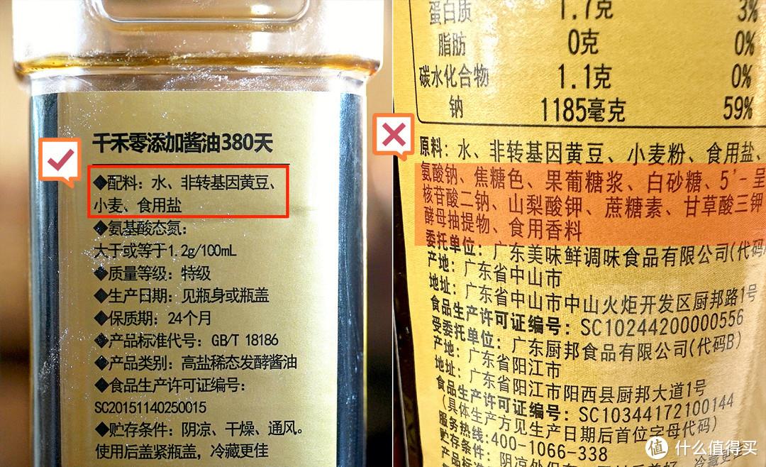 比如上图这两款,都是特级酿造酱油,但图左的钠含量比图右低了974mg,自然是首选。