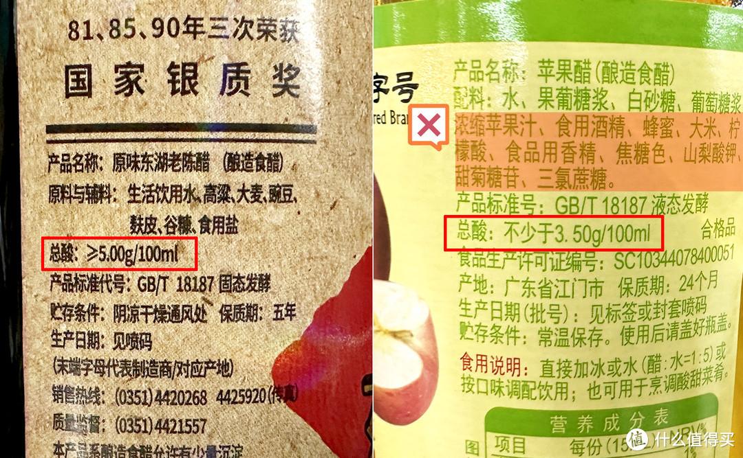 总酸度这个指标最能说明醋的品质,国标里食用醋的总酸度要≥3.5g/100ml,甜醋的总酸度要≥2.5g/100ml,低于这个标准就别买了。如果总酸度≥6g/100ml,那就可以不标保质期了,能长期储存。