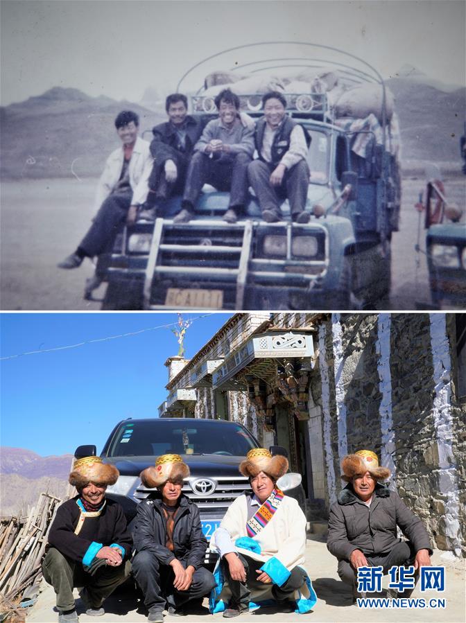 上图:1994年,24岁的强巴(右二)和他的三个兄弟在西藏阿里地区跑运输时,在自己购买的“东风”牌运输车前合影(强巴提供)。1986年,强巴购买了一台手扶拖拉机开始打工拉货。1993年,他购买了“东风”牌运输车,在西藏各地四处跑运输。下图:2018年11月26日,在西藏山南贡嘎县,48岁的强巴(右二)和他的三个兄弟在自家车前合影(新华社记者普布扎西摄)。2012年,强巴已经有了自己的公司,还购买了一辆30多万元的丰田牌私家车。 新华社发