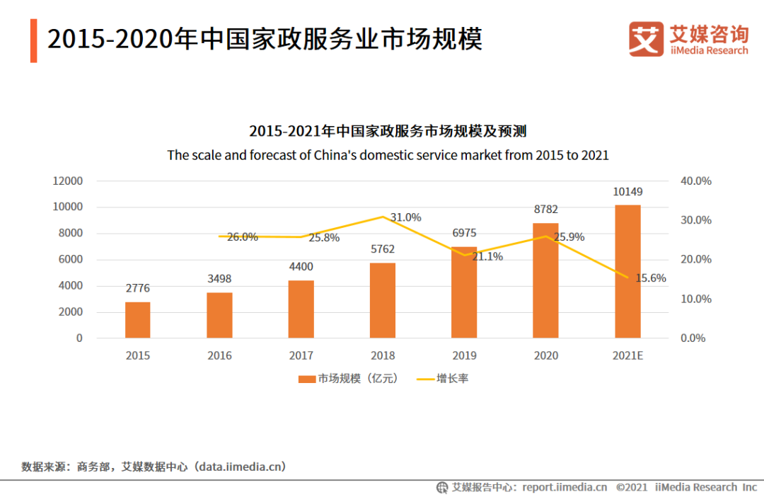 根据艾媒咨询的产业数据报告来看,2020年家政服务行业的市场规模已经达到了8782亿元,同比增长约26.0%,预计2021年中国家政行业市场规模将达到10149亿元。